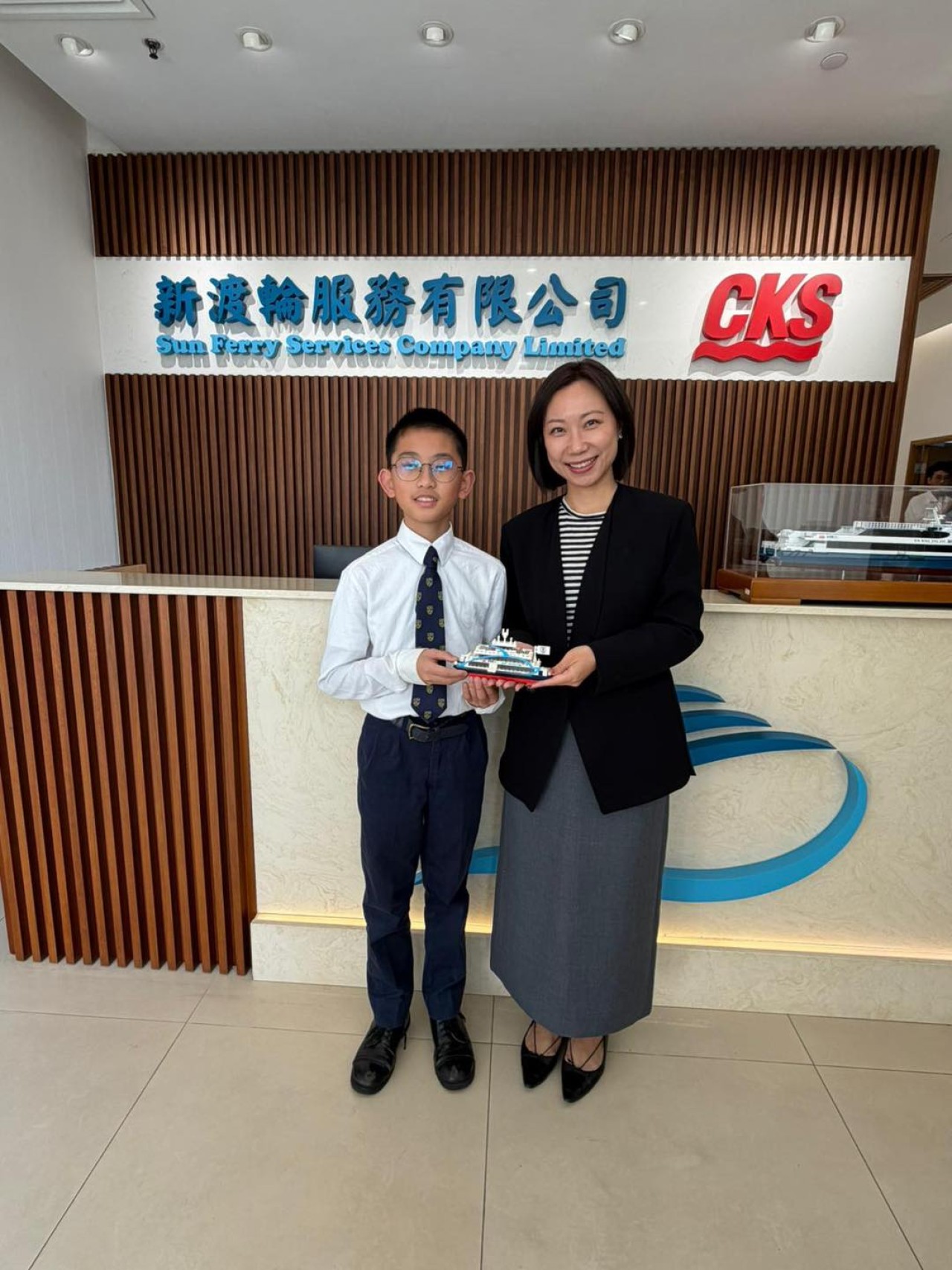 更把握機會,向新渡輪管理層介紹學生團隊參照船公司最新的【新能源船隻「新明珠39」】所製作的船隻模型